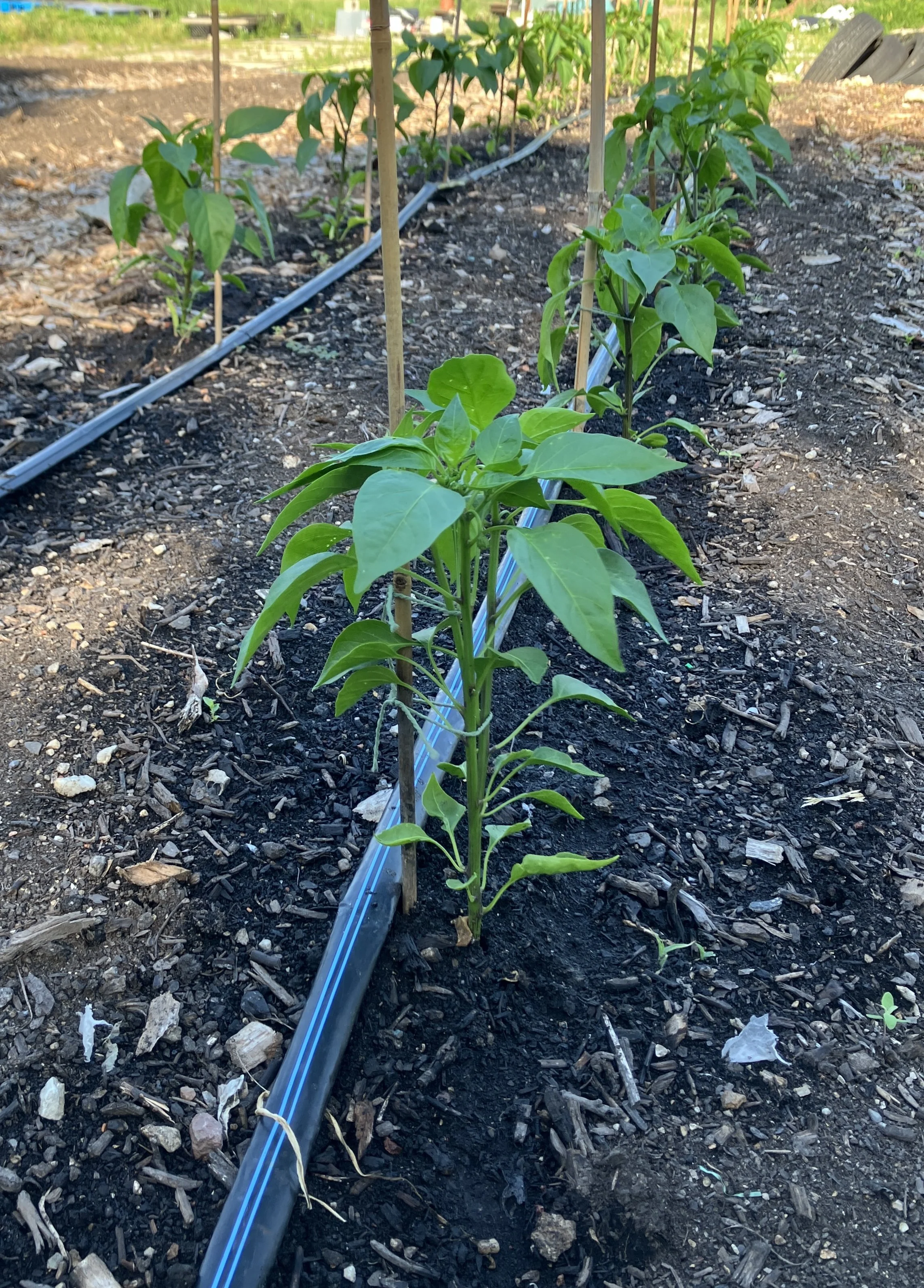 All crops are grown in raised beds and watered by drip irrigation lines to conserve water.