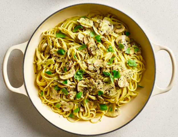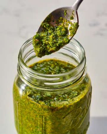 To keep basil perky for more than a few meals, trim the stems as you would flowers to remove dried-up ends, then stick the bunch in a tall glass of water. Loosely cover the basil with a plastic bag and keep it on the counter. This method allows moisture to stay in while ethylene escapes, making for basil that remains vibrant for nearly a week.