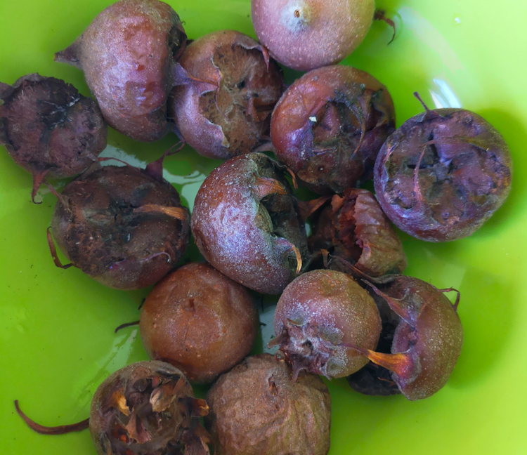 To be eaten raw they may need to be stored before using. Ideally briefly dip the stalks in a saturated salt solution, this prevents rotting. Store the fruit eye downwards and not touching in trays in a cool, dark place. Use when the fruit is 'bletted', that is, the flesh softens and turns brown, but not rotten.