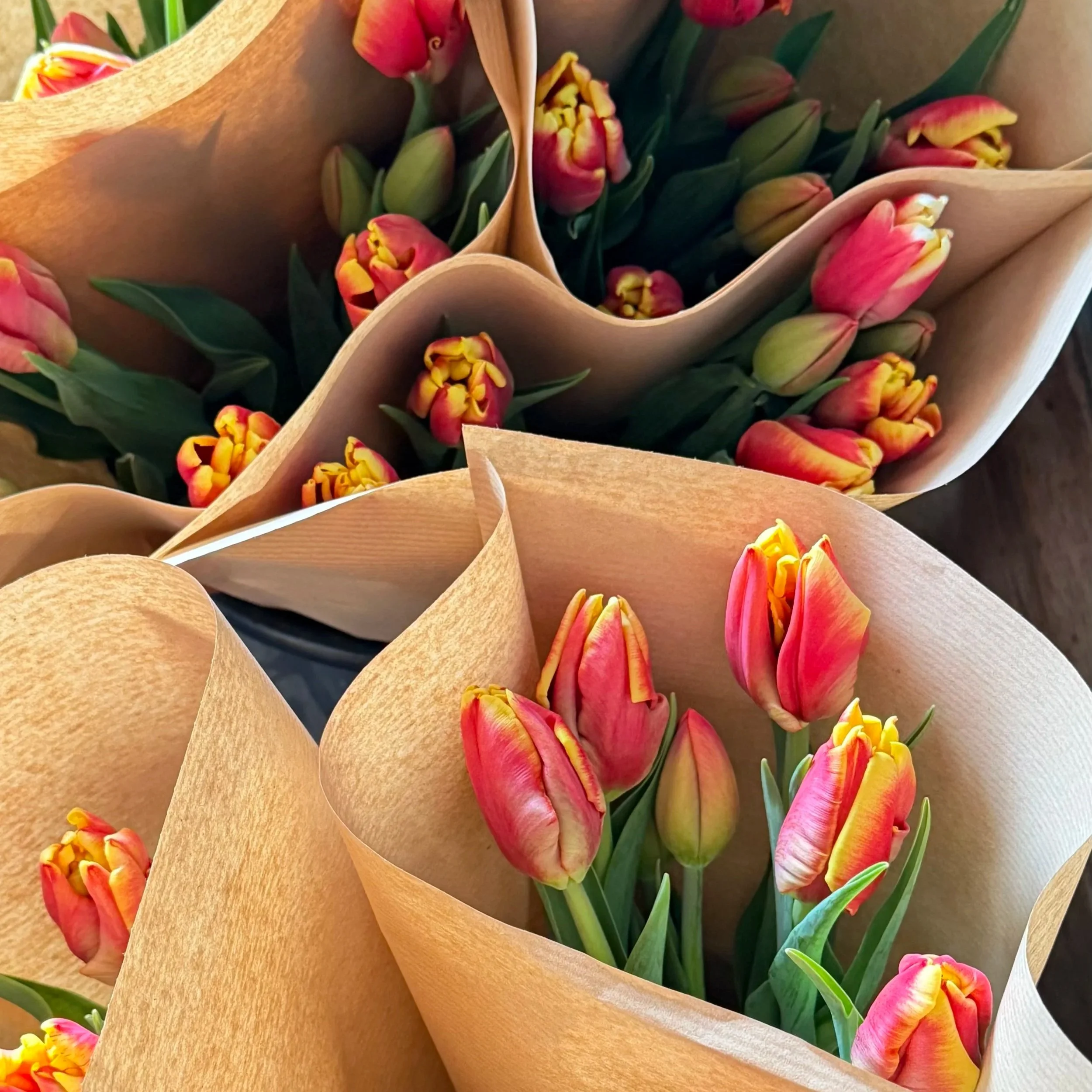 These tulips are grown hyper local, within 10 miles of our facility, and are grown without excessive inputs or waste, featuring local tulips and specialty flowers. These blooms last 6-9 days compared to the 2-3 days of store bought. Colors will vary.